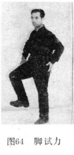 1.脚試力 両脚を揃えて立ち、両手を自然に下ろす。右脚の前底部を前に蹴り出し、膝より高くない高さで(図64)、ゆっくりと元の位置に戻す。その後、左脚で同じ動作を行い、繰り返す。 意念誘導: まずは皮の球を蹴るように、次に木の球を蹴るように、さらには…