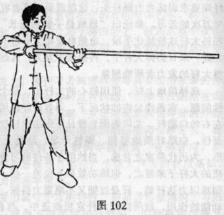 左式を例にすると、ほとんどの姿勢の要点は托嬰樁と同じで、異なるのは両腕の位置がやや下げられ、高さは胸のあたりになり、両手で大杆の末端の約三分の一を軽く握り、前方に三分の二の杆身を空け、斜面で敵に向かうことである。前手は陽把で、托力を含み、後手は陰把で、按力を蓄える。二つの力が合わさり、その力度は大杆の重さにちょうど等しい。少しでも力が少なければ弛み、多すぎれば硬直する。大杆は身体に貼り付くようで貼り付いておらず、眼光は大杆の先端を通して遠くを射る。人と杆が一体となり、蓄勢待発である(図102)。